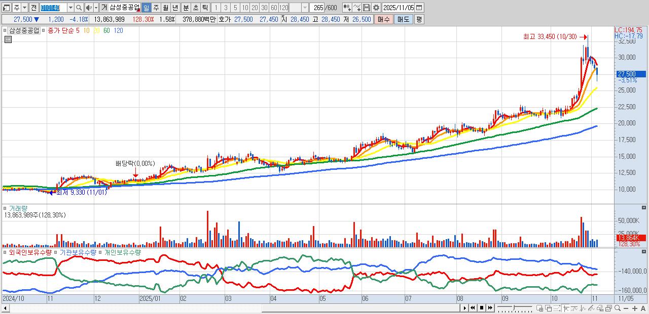 - 삼성중공업 (27,450원 ▼ -4.36% , 시총: 241,560억, 거래량: 7,768,023, 거래대금:2,119억)