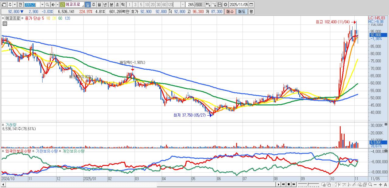 - 에코프로 (92,800원 ▼ -3.03% , 시총: 126,000억, 거래량: 6,536,141, 거래대금:6,013억)