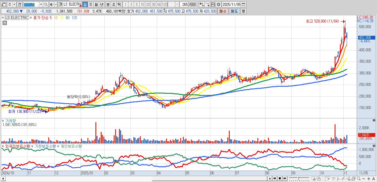 - LS ELECTRIC (451,500원 ▼ -5.94% , 시총: 135,450억, 거래량: 742,991, 거래대금:3,275억)
