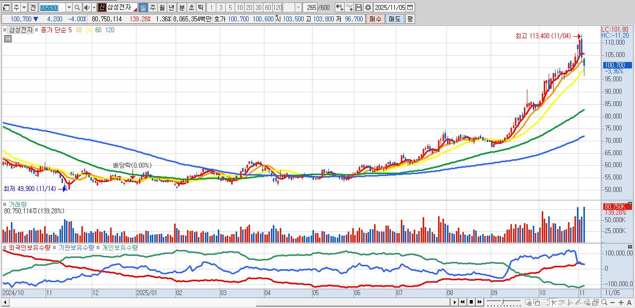 - 삼성전자 (100,600원 ▼ -4.1% , 시총: 5,955,156억, 거래량: 44,843,020, 거래대금:44,728억)