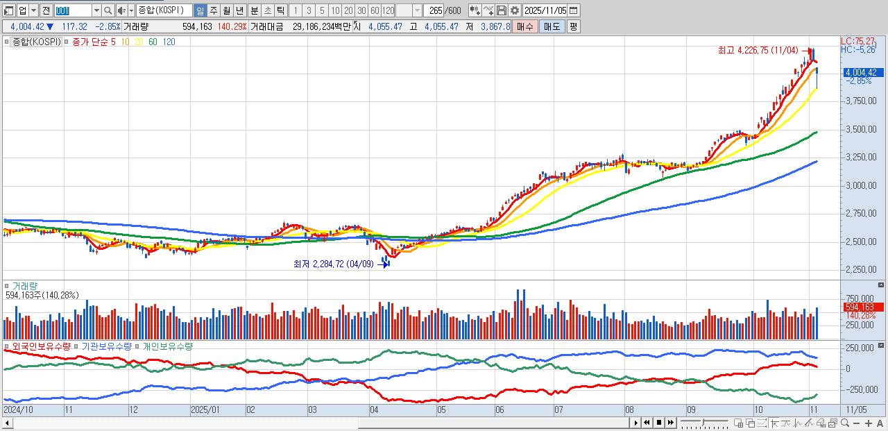 | 11/05 | 4,004.42 | ▼-2.85% | 25,538억 | -20,695억 | -1,877억 | -2,966억 |