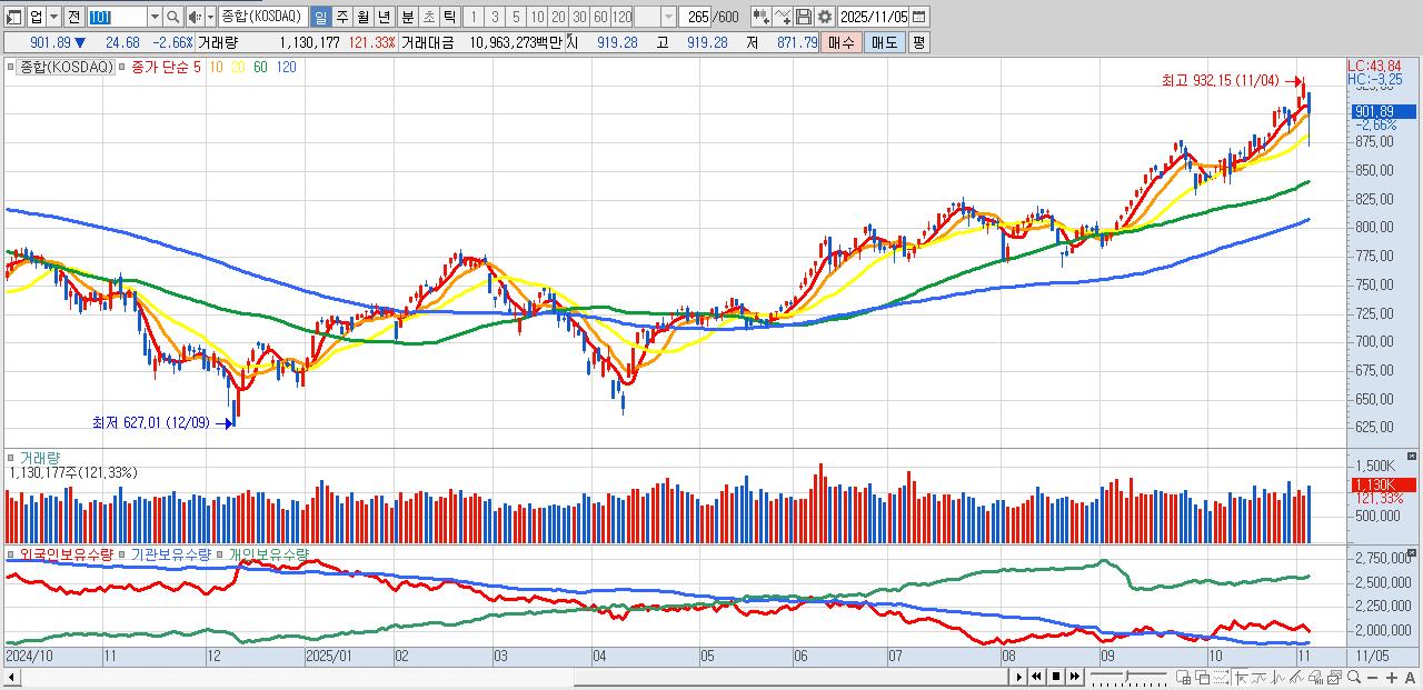 | 11/05 | 901.89 | ▼-2.66% | 5,650억 | -5,983억 | 468억 | -136억 |