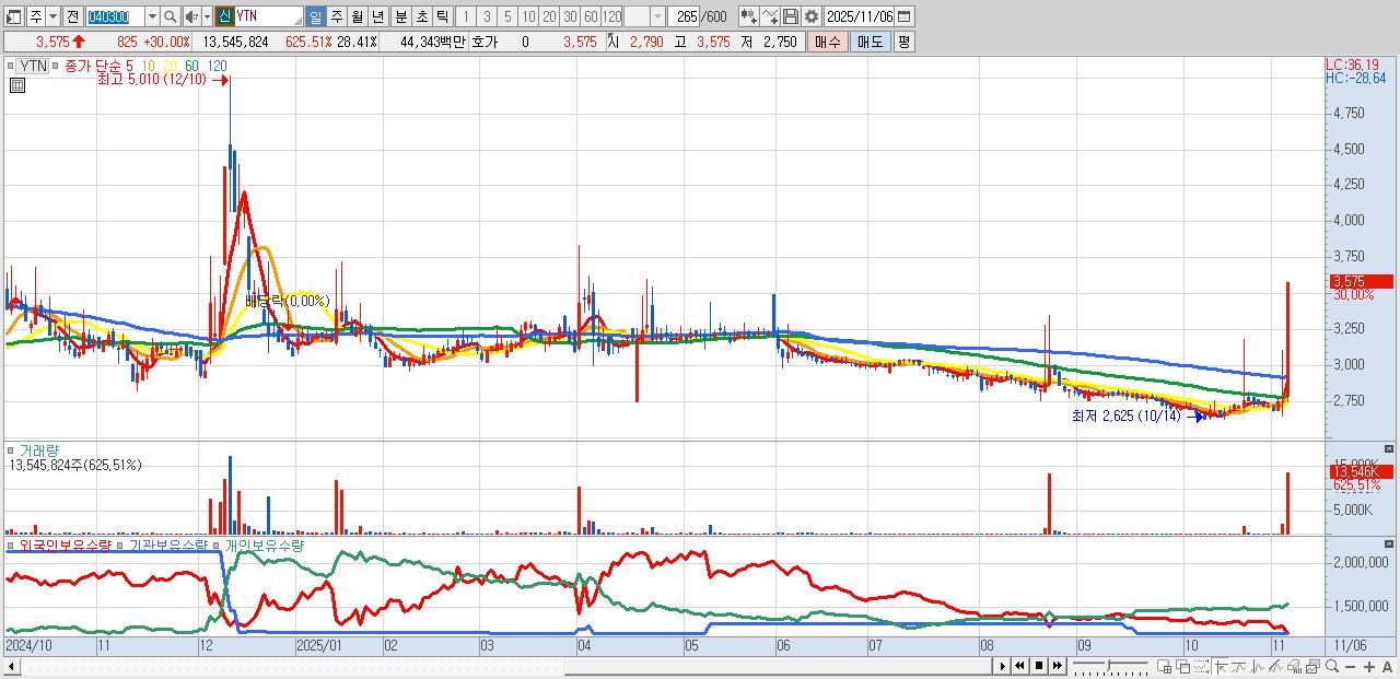 - YTN (3,575원 ▲ 30% , 시총: 1,704억, 거래량: 13,545,824, 거래대금:443억)