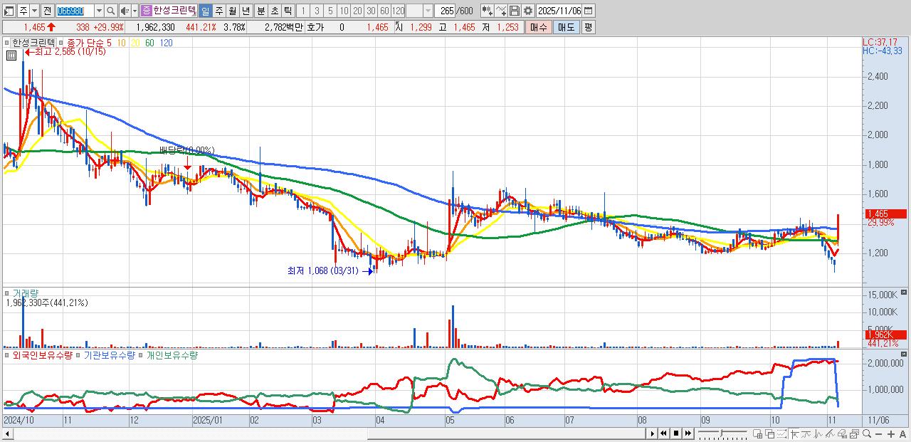 2.한성크린텍 1,465원 ▲ 29.99% (KOSDAQ, 066980)