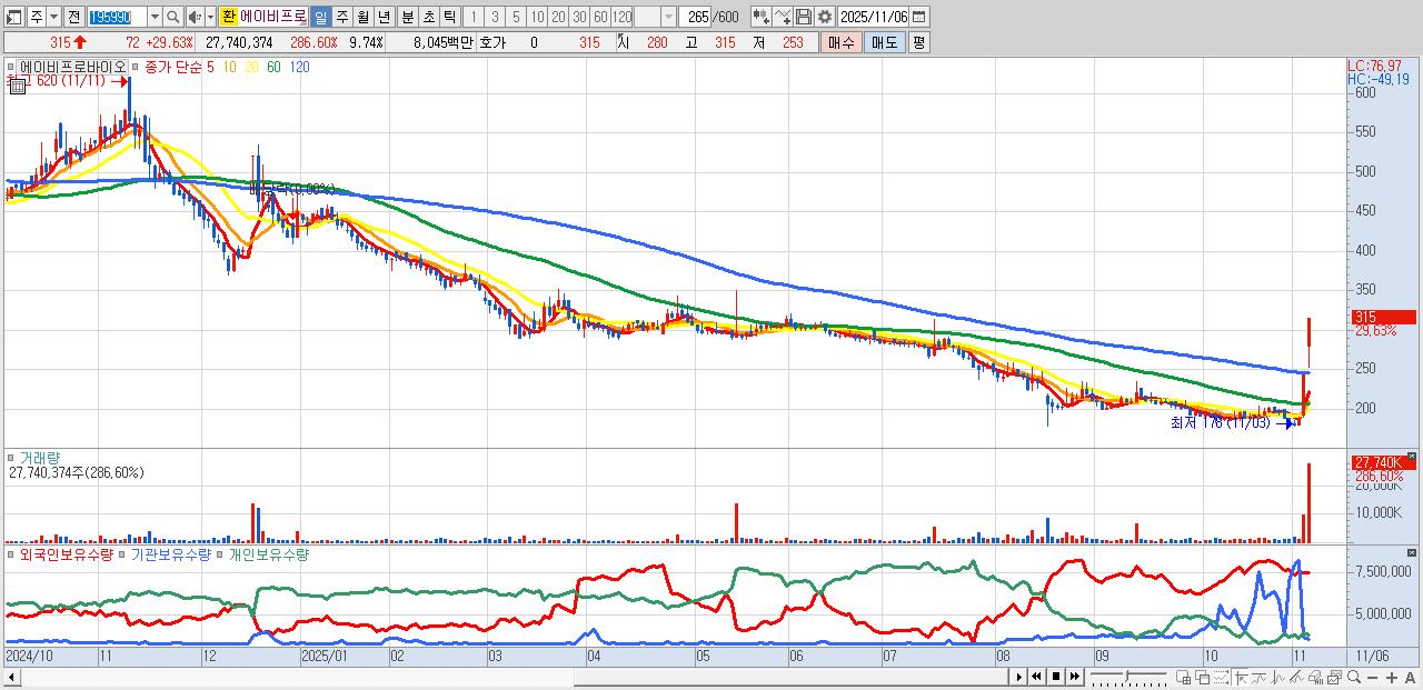 - 에이비프로바이오 (315원 ▲ 29.63% , 시총: 897억, 거래량: 27,740,374, 거래대금:80억)