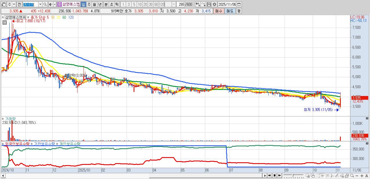 - 삼영에스앤씨 (3,935원 ▲ 12.43% , 시총: 223억, 거래량: 230,936, 거래대금:9억)