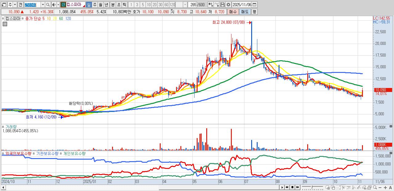 - 킵스파마 (10,330원 ▲ 19.15% , 시총: 2,074억, 거래량: 557,962, 거래대금:55억)