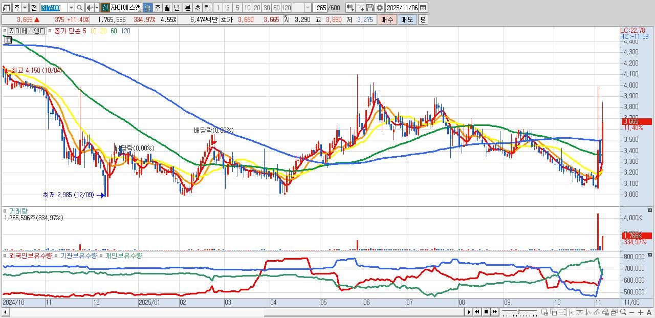- 자이에스앤디 (3,665원 ▲ 11.4% , 시총: 1,421억, 거래량: 1,765,596, 거래대금:65억)
