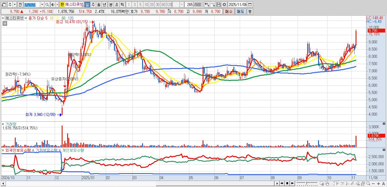 - 에스티큐브 (9,790원 ▲ 15.18% , 시총: 6,656억, 거래량: 1,678,756, 거래대금:161억)