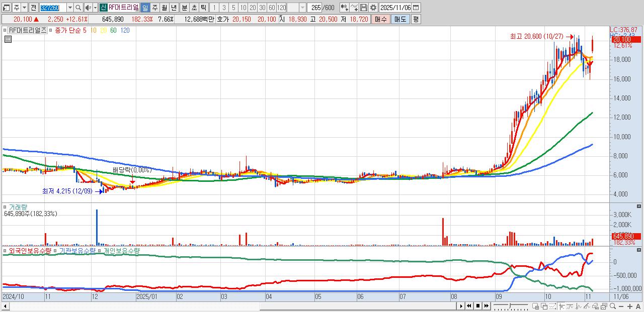 - RF머트리얼즈 (20,100원 ▲ 12.61% , 시총: 1,695억, 거래량: 645,890, 거래대금:127억)