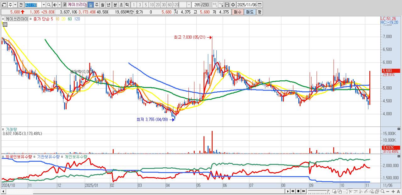 - 케이쓰리아이 (5,680원 ▲ 29.83% , 시총: 425억, 거래량: 3,637,106, 거래대금:197억)