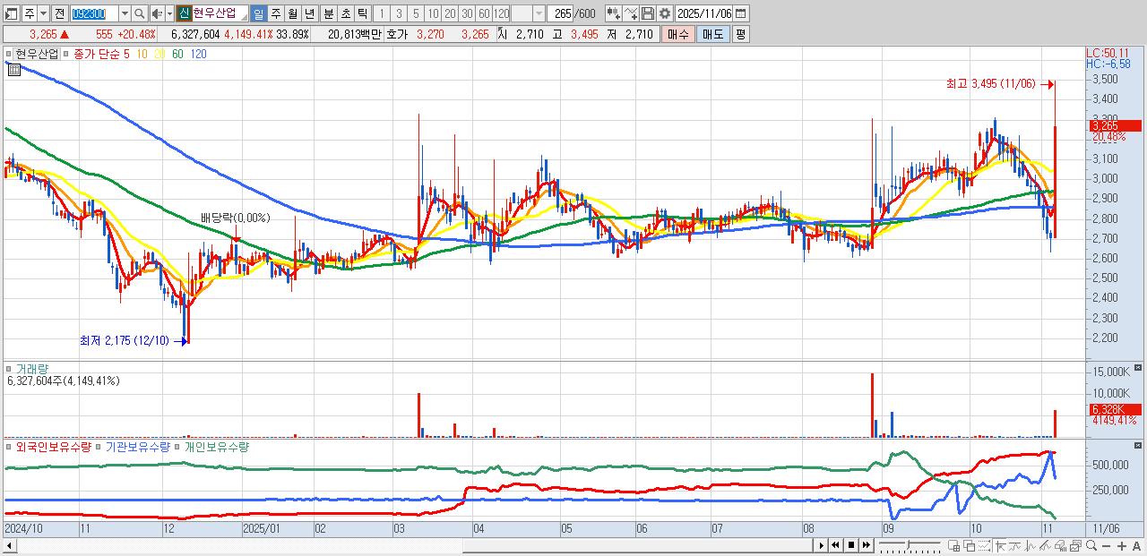 - 현우산업 (3,265원 ▲ 20.48% , 시총: 610억, 거래량: 6,327,604, 거래대금:208억)