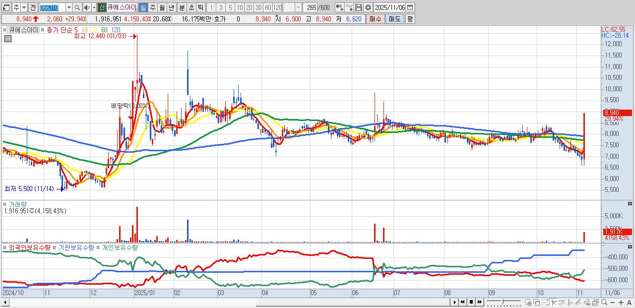 - 큐에스아이 (8,940원 ▲ 29.94% , 시총: 829억, 거래량: 1,916,951, 거래대금:162억)