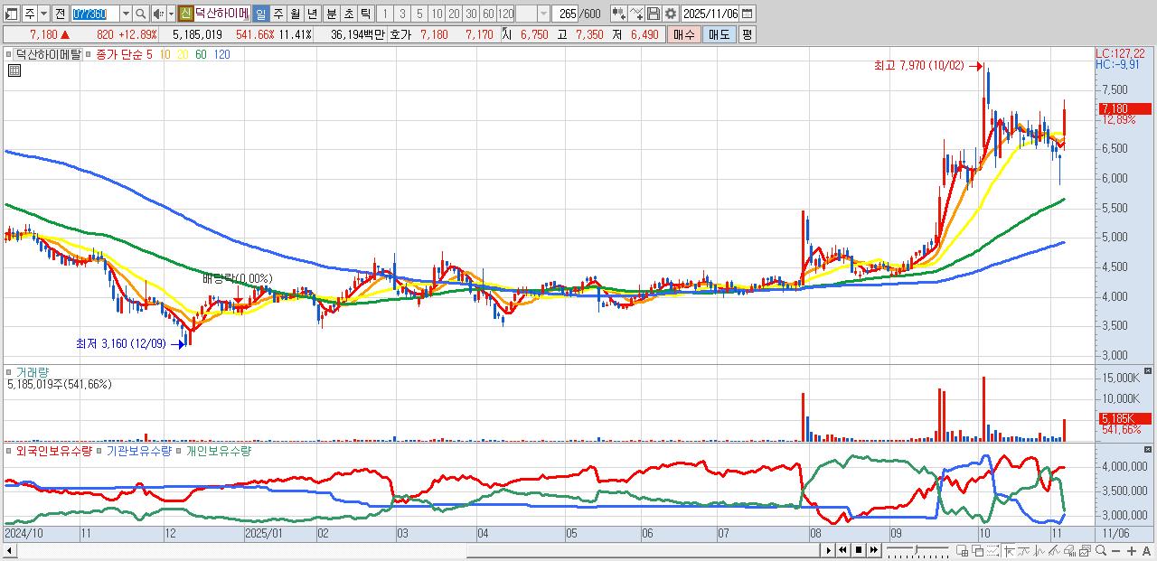 - 덕산하이메탈 (7,180원 ▲ 12.89% , 시총: 3,262억, 거래량: 5,185,019, 거래대금:362억)