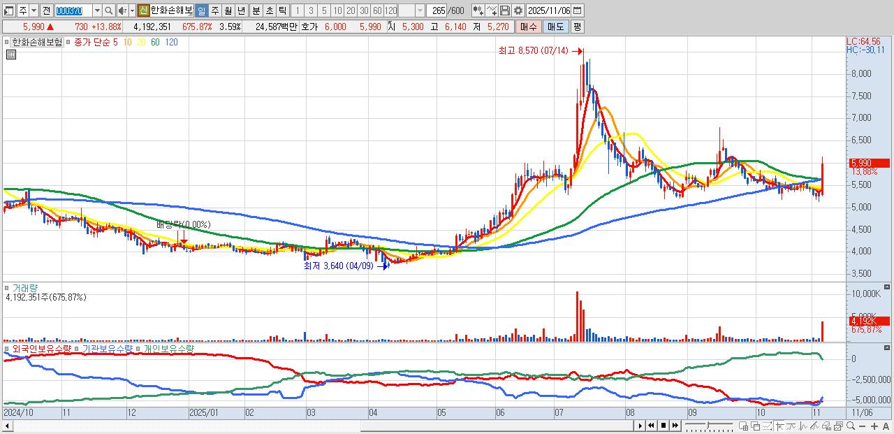 - 한화손해보험 (5,990원 ▲ 13.88% , 시총: 6,993억, 거래량: 4,192,351, 거래대금:246억)