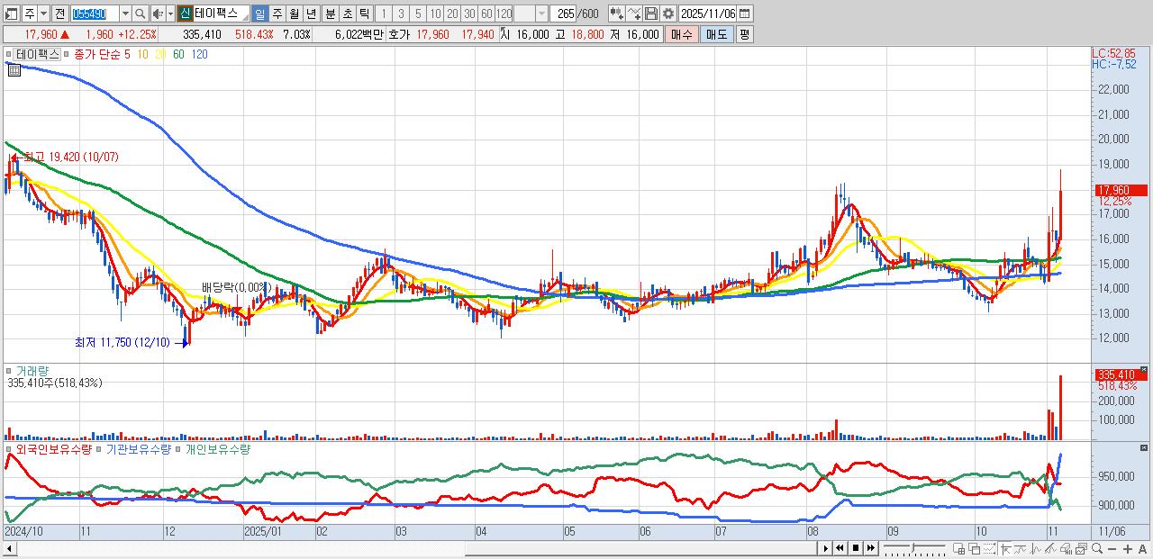 - 테이팩스 (17,960원 ▲ 12.25% , 시총: 857억, 거래량: 335,410, 거래대금:60억)