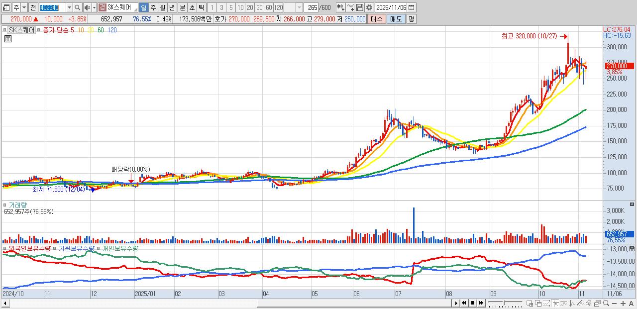- SK스퀘어 (270,000원 ▲ 3.85% , 시총: 357,860억, 외국인 순매수 거래금:98억)