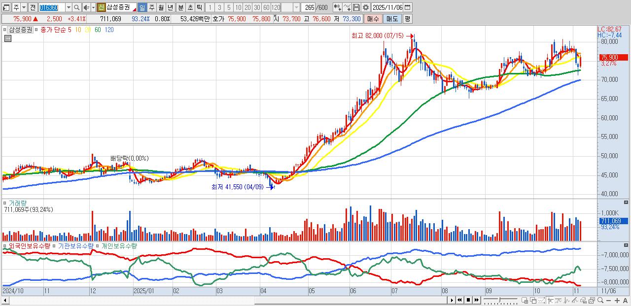 - 삼성증권 (75,800원 ▲ 3.27% , 시총: 67,689억, 외국인 순매수 거래금:65억)