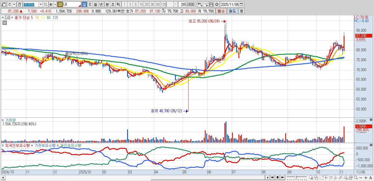 - LG (86,500원 ▲ 8.53% , 시총: 133,402억, 외국인 순매수 거래금:152억)