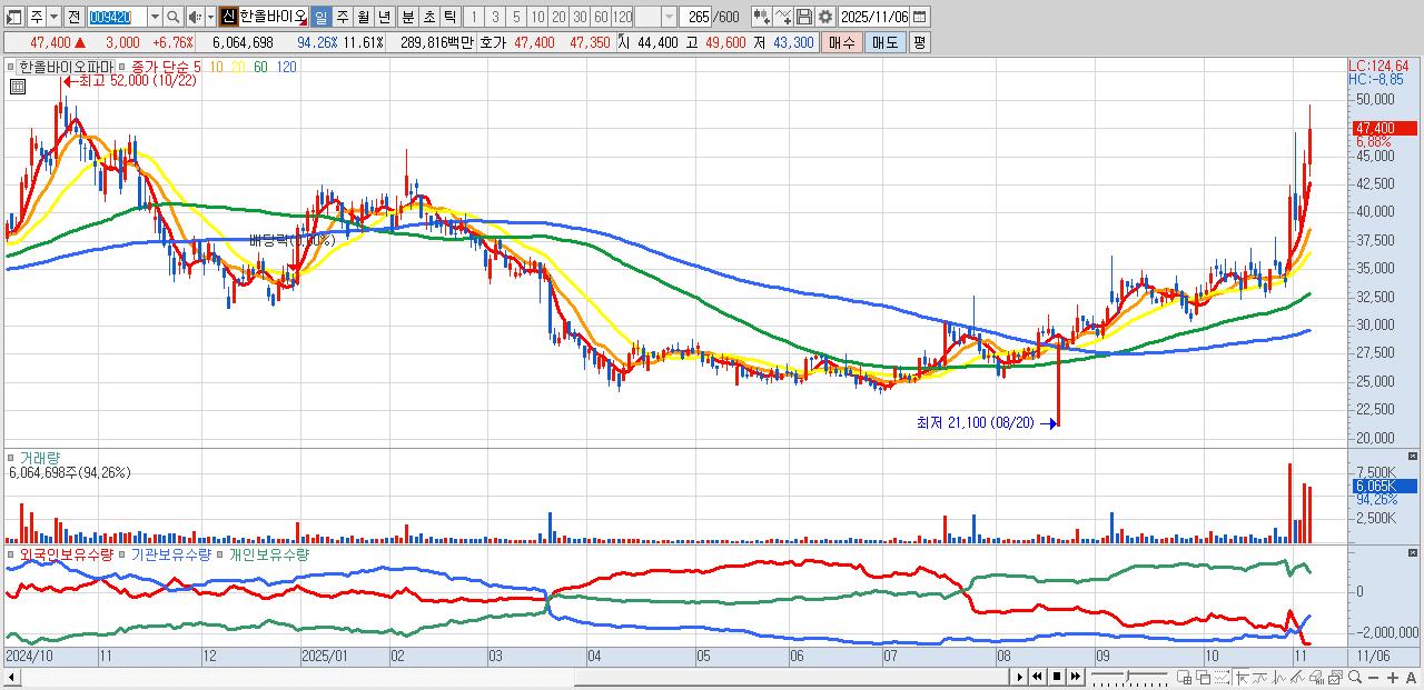 - 한올바이오파마 (47,350원 ▲ 6.64% , 시총: 24,736억, 외국인 순매수 거래금:88억)