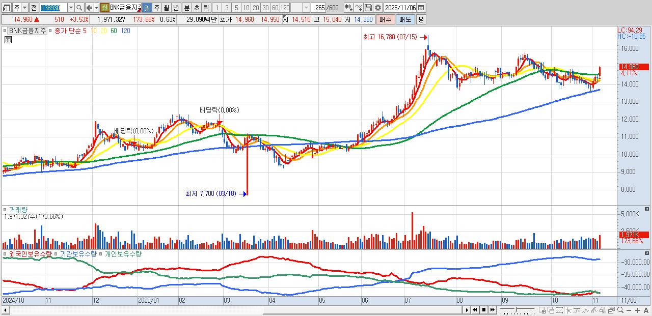 - BNK금융지주 (14,950원 ▲ 3.46% , 시총: 47,007억, 외국인 순매수 거래금:67억)