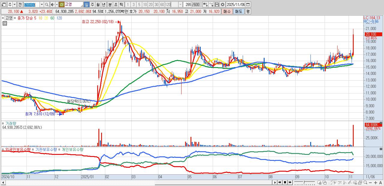 - 고영 (20,100원 ▲ 23.46% , 시총: 13,800억, 외국인 순매수 거래금:258억)