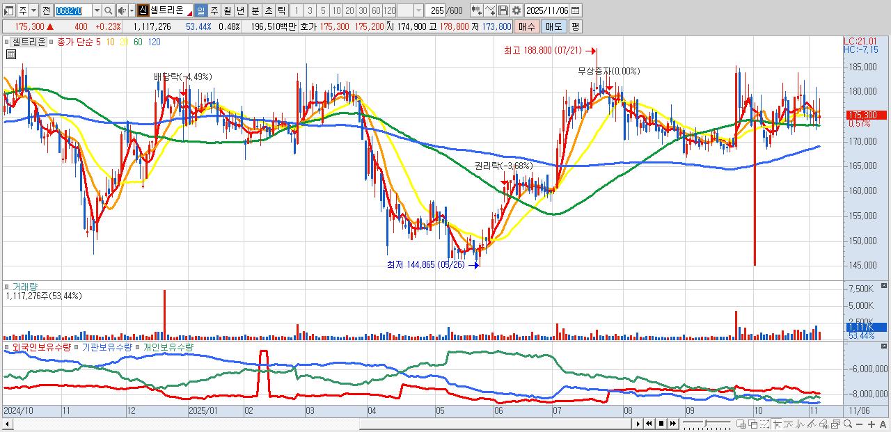 - 셀트리온 (174,700원 ▼ -0.11% , 시총: 403,451억, 외국인 순매수 거래금:157억)