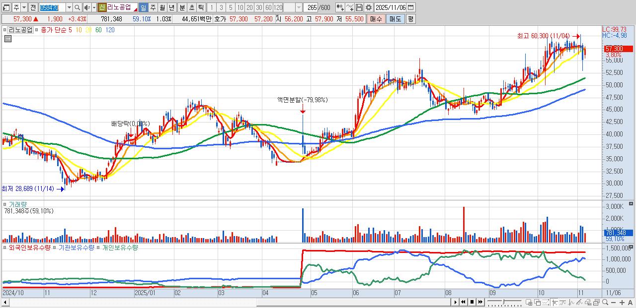 - 리노공업 (57,600원 ▲ 3.97% , 시총: 43,898억, 외국인 순매수 거래금:84억)
