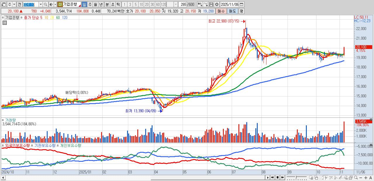 - 기업은행 (20,100원 ▲ 4.04% , 시총: 160,283억, 외국인 순매수 거래금:171억)