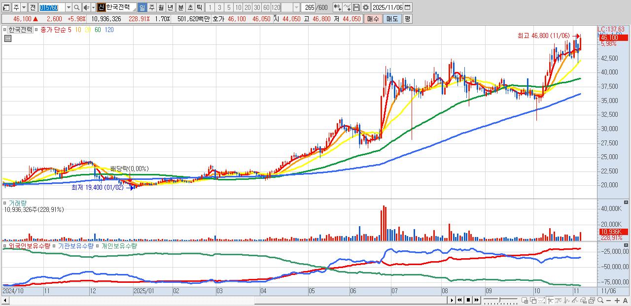 - 한국전력 (46,100원 ▲ 5.98% , 시총: 295,945억, 외국인 순매수 거래금:268억)