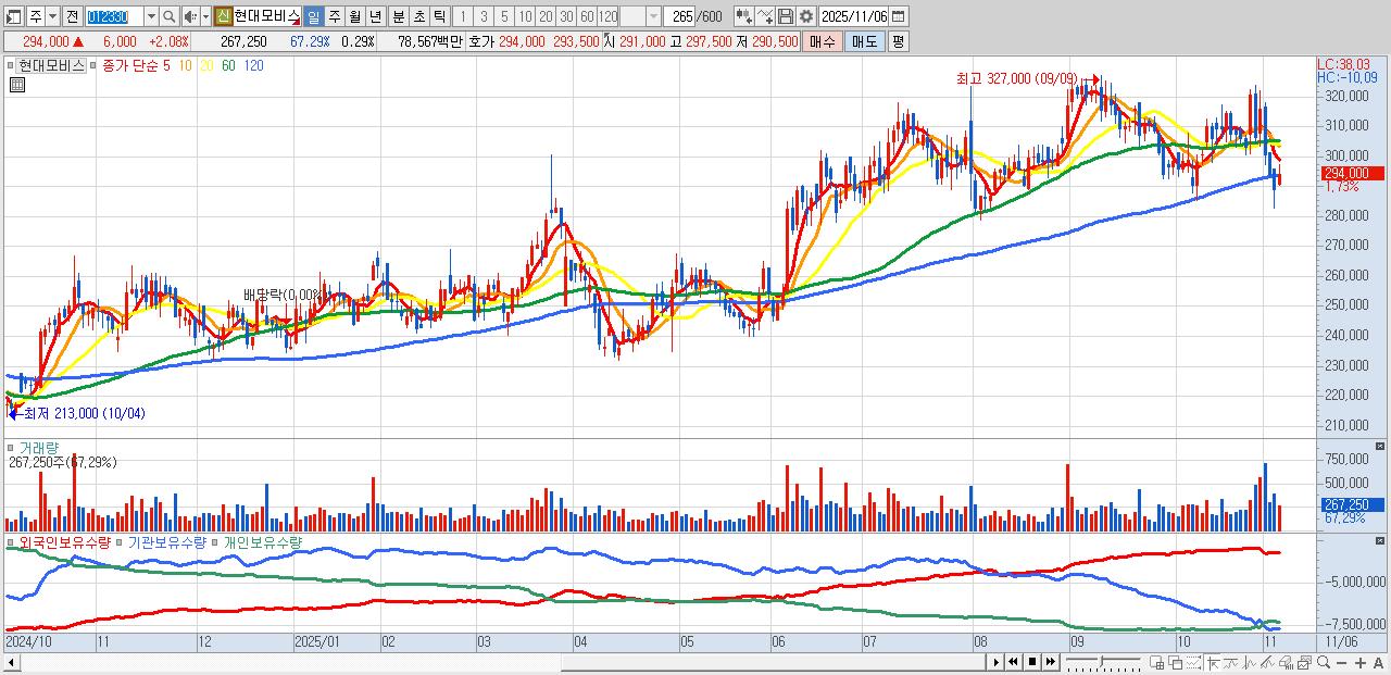 - 현대모비스 (294,500원 ▲ 2.26% , 시총: 270,337억, 외국인 순매수 거래금:77억)