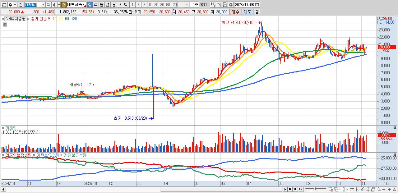 - NH투자증권 (20,600원 ▲ 1.48% , 시총: 73,407억, 외국인 순매수 거래금:125억)