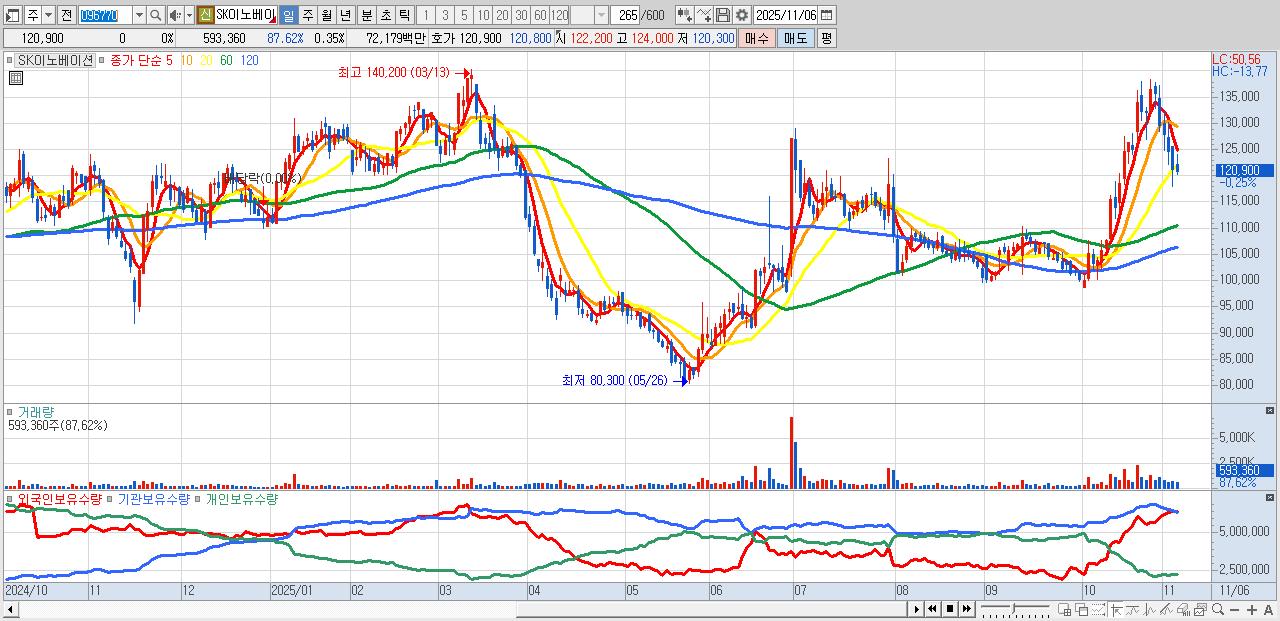 - SK이노베이션 (120,800원 ▼ -0.08% , 시총: 204,216억, 외국인 순매수 거래금:85억)