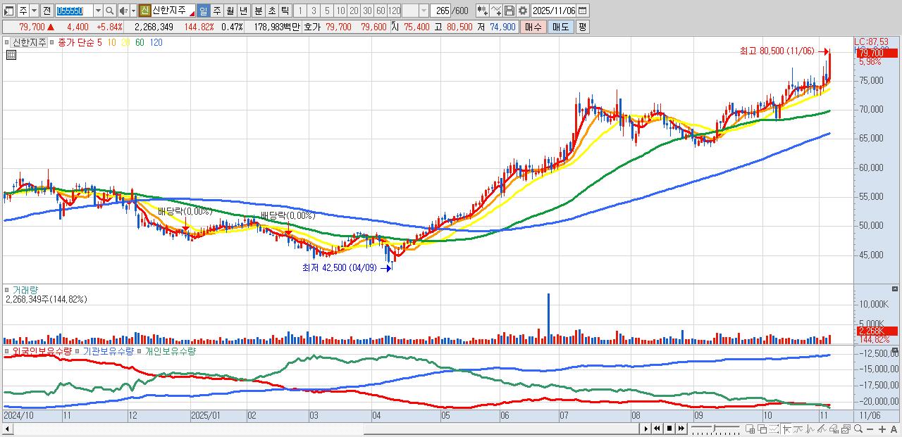 - 신한지주 (79,200원 ▲ 5.18% , 시총: 384,512억, 외국인 순매수 거래금:65억)