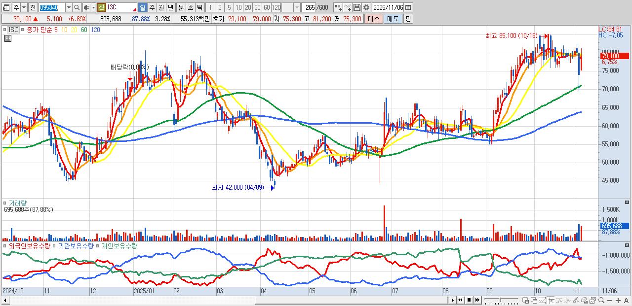 - ISC (80,000원 ▲ 8.11% , 시총: 16,958억, 외국인 순매수 거래금:139억)