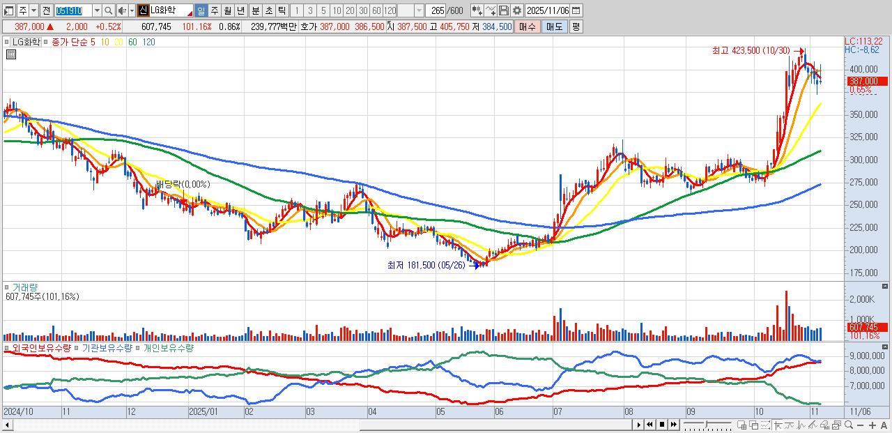 - LG화학 (385,500원 ▲ 0.13% , 시총: 272,133억, 외국인 순매수 거래금:80억)
