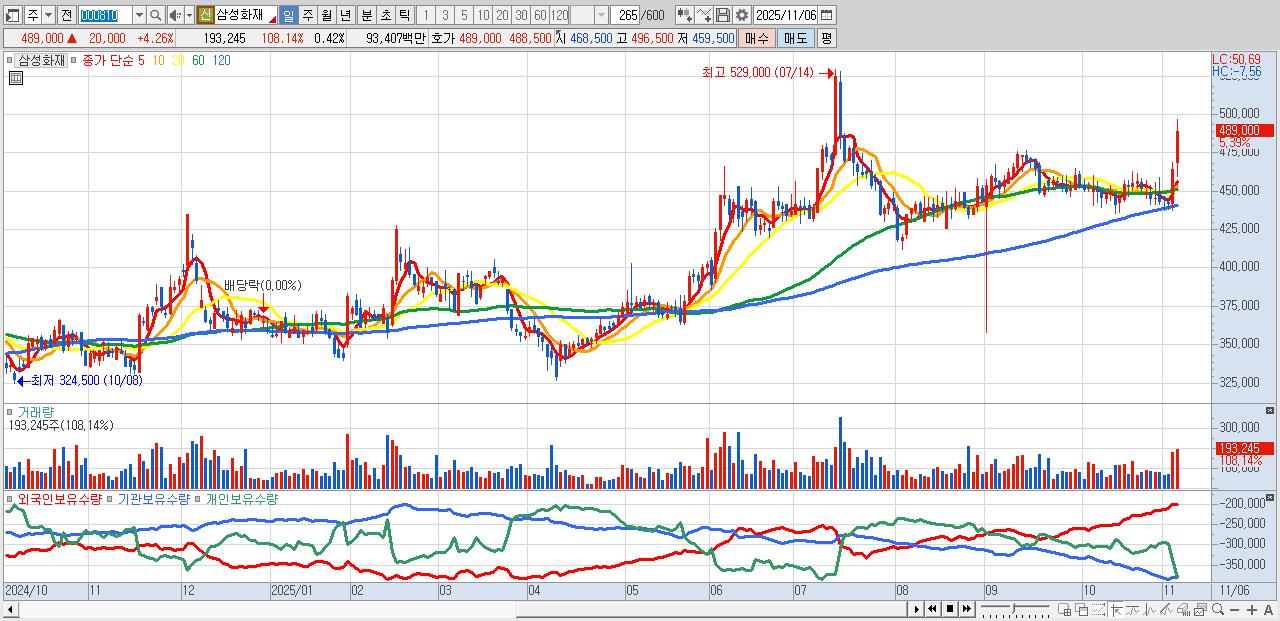 - 삼성화재 (493,500원 ▲ 5.22% , 시총: 227,065억, 외국인 순매수 거래금:171억)