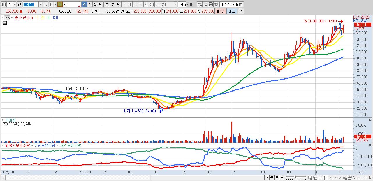 - SK (254,000원 ▲ 6.95% , 시총: 184,157억, 외국인 순매수 거래금:202억)