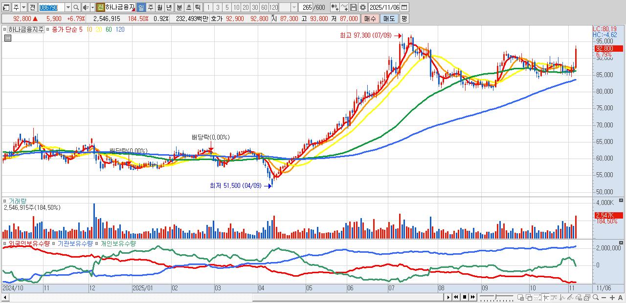 1.하나금융지주 93,000원 ▲ 7.02% (KOSPI, 086790)