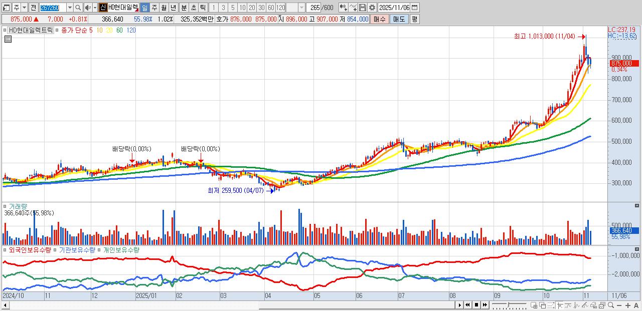 - HD현대일렉트릭 (875,000원 ▲ 0.81% , 시총: 315,412억, 거래량: 269,245, 거래대금:2,386억)
