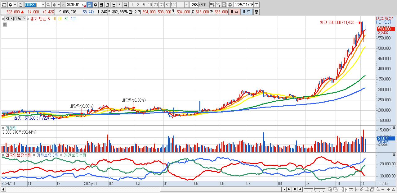 - SK하이닉스 (593,000원 ▲ 2.42% , 시총: 4,317,054억, 거래량: 5,321,244, 거래대금:31,755억)