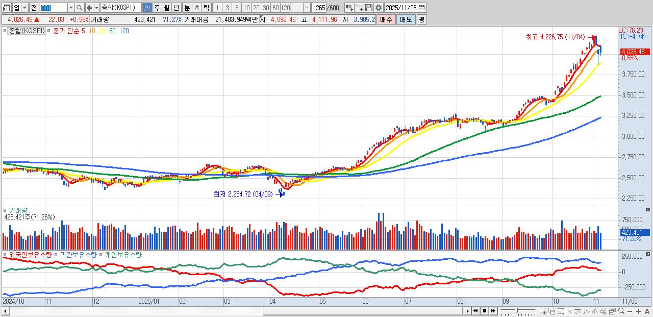 | 11/06 | 4,026.45 | ▲0.55% | 8,840억 | -16,950억 | 8,301억 | -191억 |
