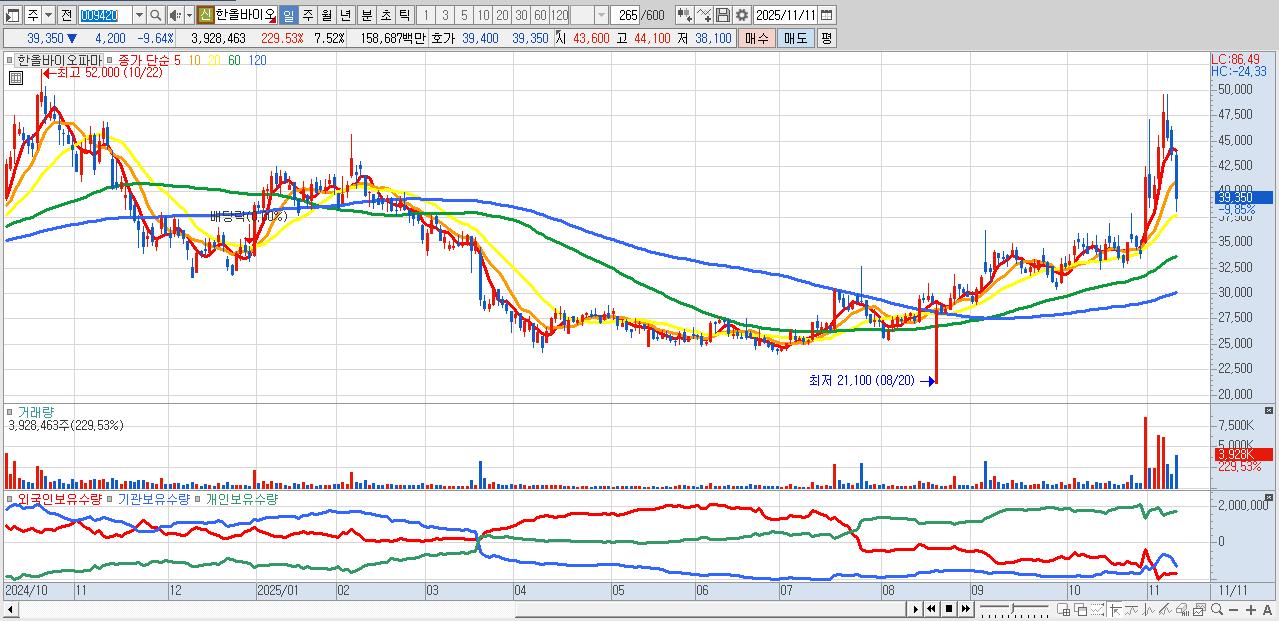 - 한올바이오파마 (39,200원 ▼ -9.99% , 시총: 20,478억, 외국인 순매수 거래금:95억)