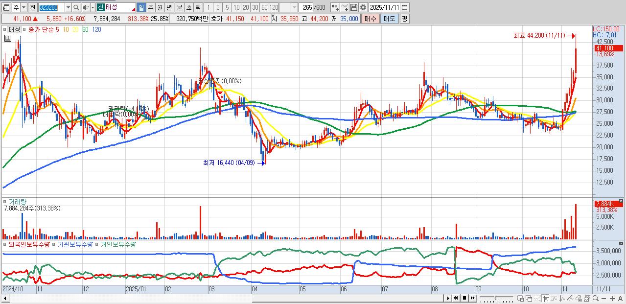- 태성 (40,650원 ▲ 15.32% , 시총: 12,399억, 외국인 순매수 거래금:140억)