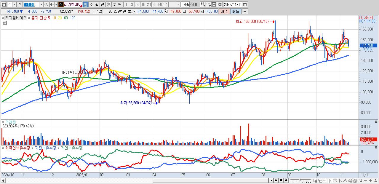 - 리가켐바이오 (145,200원 ▼ -2.16% , 시총: 53,158억, 외국인 순매수 거래금:88억)