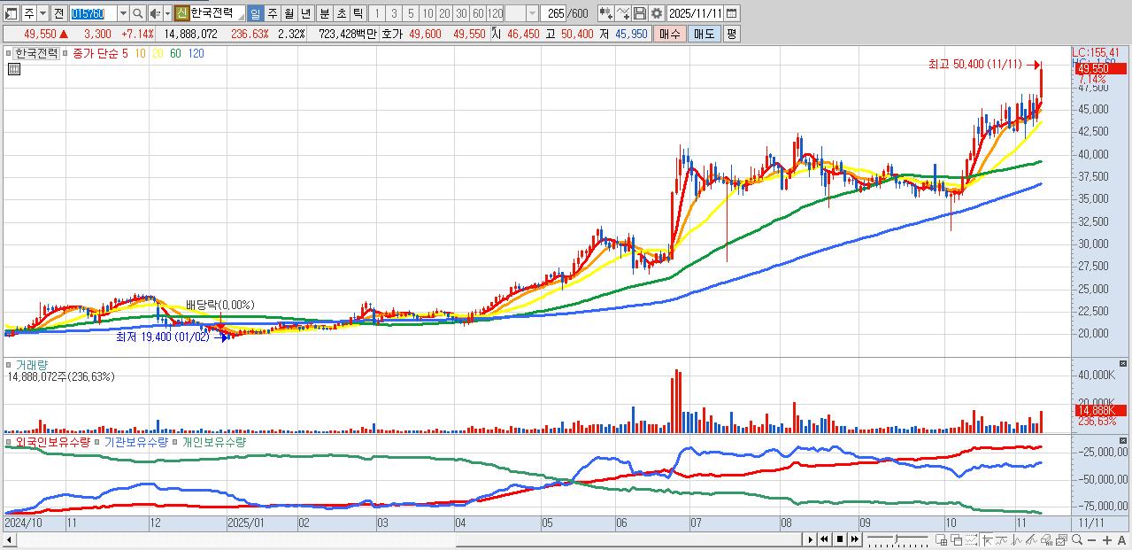 - 한국전력 (49,550원 ▲ 7.14% , 시총: 318,093억, 외국인 순매수 거래금:250억)
