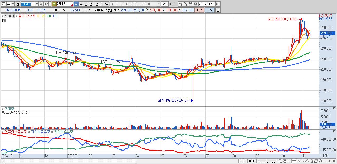 - 현대차 (269,000원 ▼ -0.55% , 시총: 550,798억, 외국인 순매수 거래금:83억)