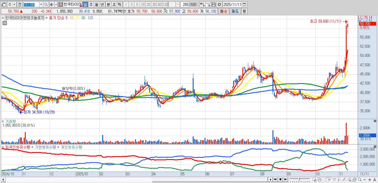 - 한국타이어앤테크놀로지 (59,300원 ▲ 1.37% , 시총: 73,458억, 거래량: 838,419, 거래대금:492억, KOSPI)