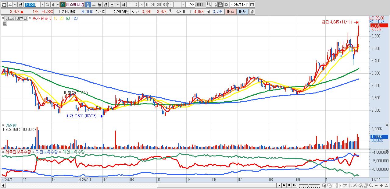 - 에스에이엠티 (3,975원 ▲ 4.33% , 시총: 3,975억, 거래량: 1,209,158, 거래대금:48억, KOSDAQ)