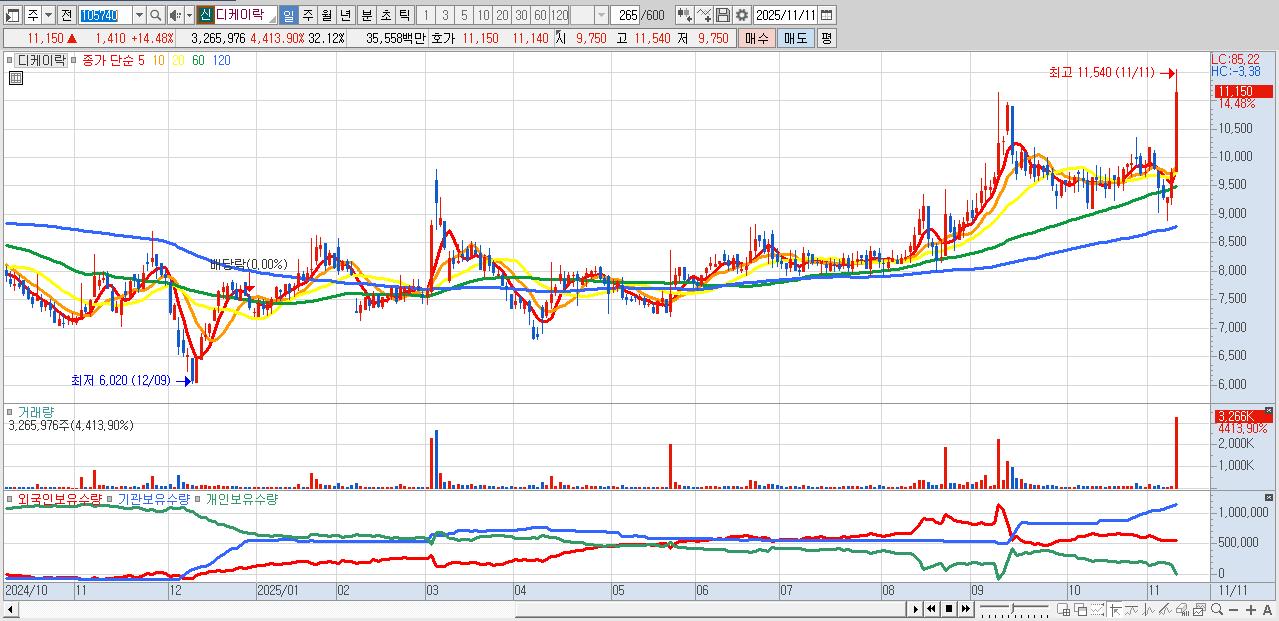 디케이락 11,150원 ▲ 14.48% (KOSDAQ, 105740)